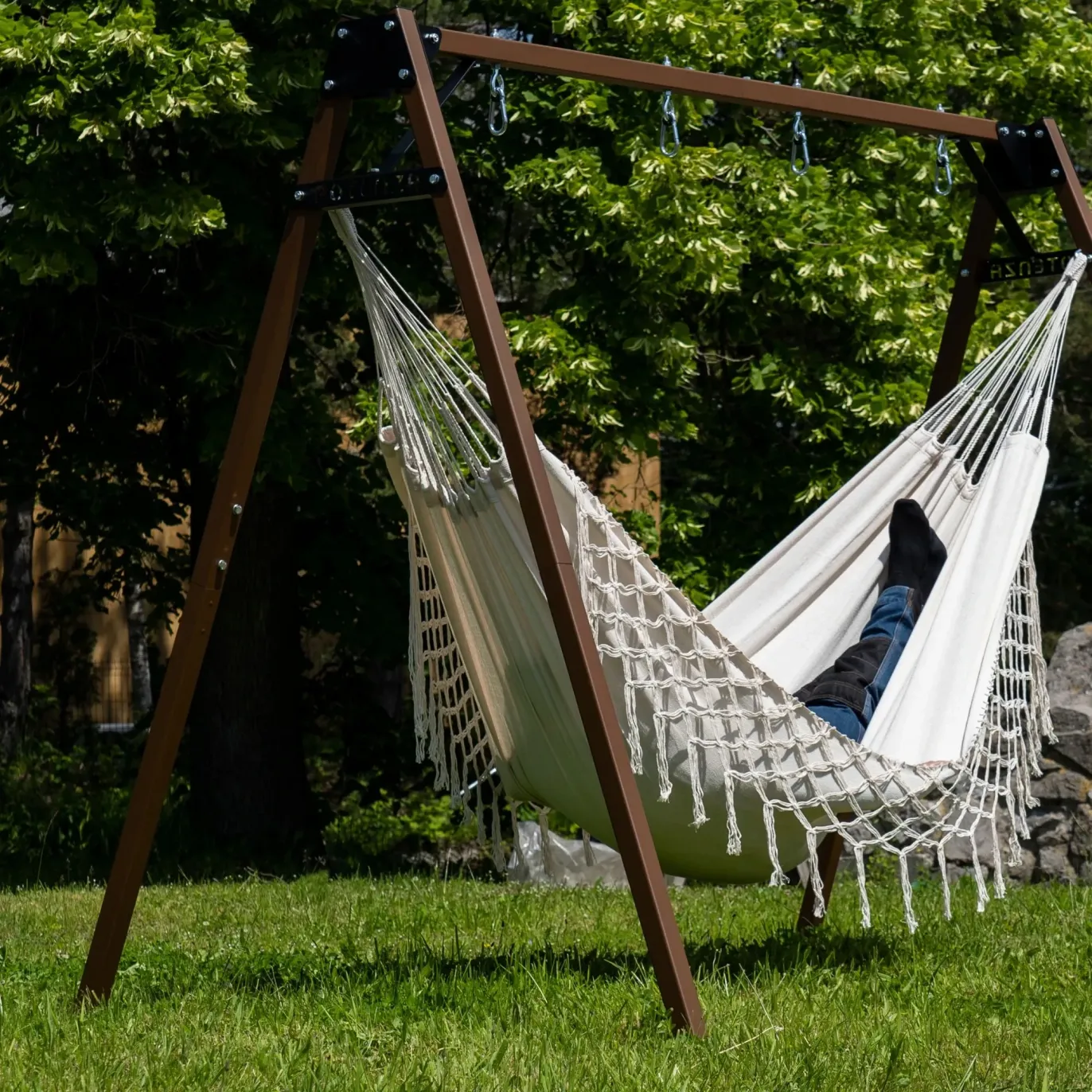 Das Schaukelgestell wurde aus einem breiten, robusten Stahlprofil mit einer Stärke von 50 x 50 x 2 mm gefertigt. Dieses Profil gewährleistet außergewöhnliche Stabilität, Belastbarkeit (bis zu 200 kg) und Nutzungssicherheit.